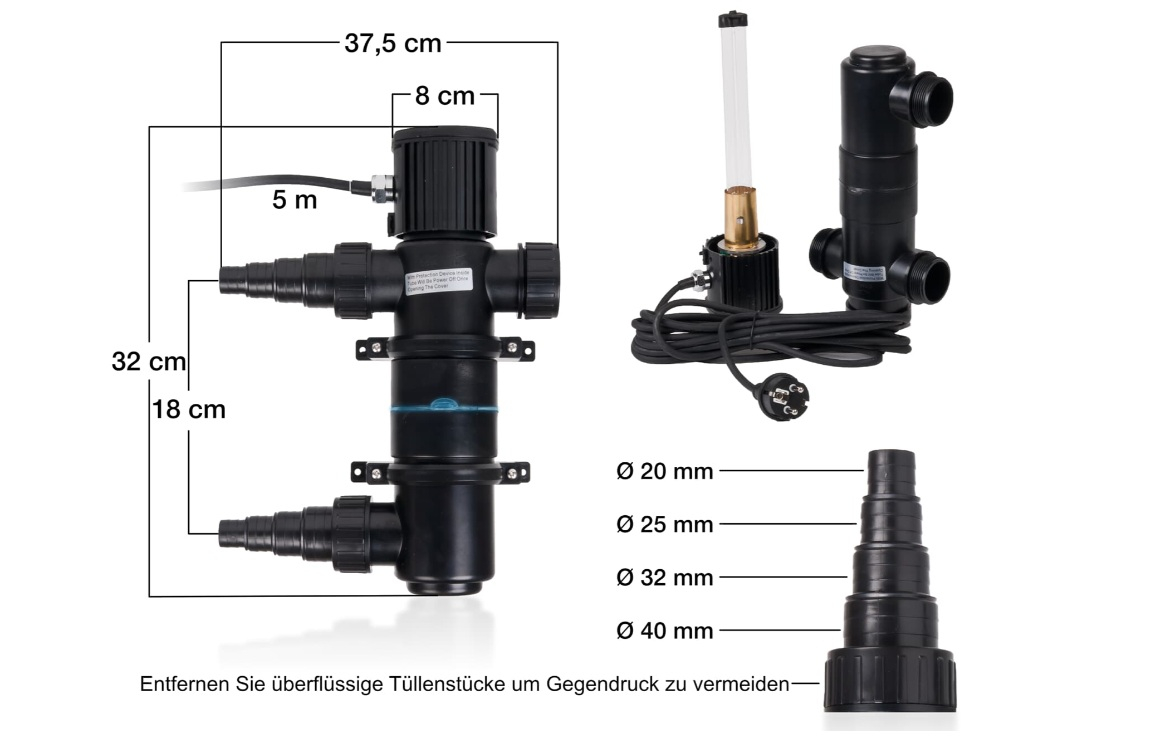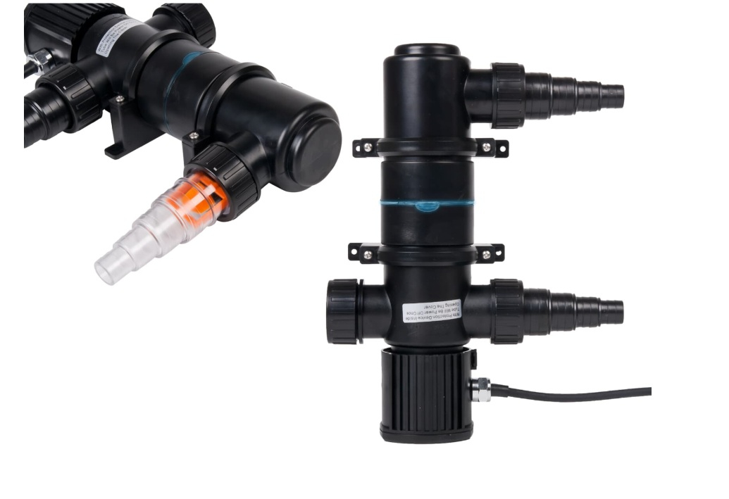 Dispozitivul este ușor de instalat în sistemele de filtrare cu pompă externă și este compatibil cu furtunuri de diferite diametre (20/25/32/40 mm). Apa trece prin tubul UV-C, fiind expusă radiației germicide fără a afecta fauna sau flora acvatică.